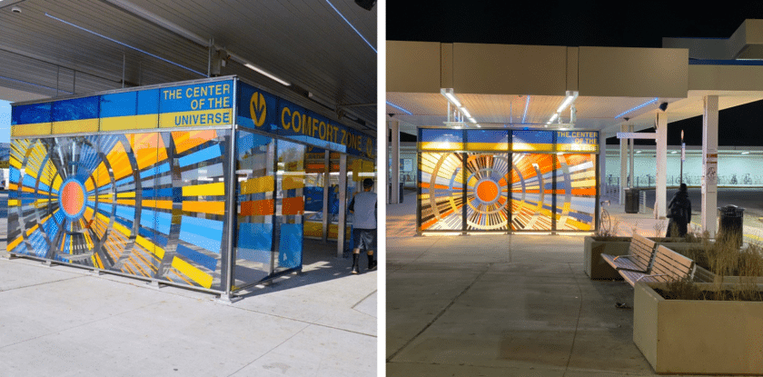 Shown above: Custom digitally printed glass windbreak panels at the Jefferson Park Transit Center. Fabricated by Skyline. Public art installation Center of the Universe by Jamie Pawlus.