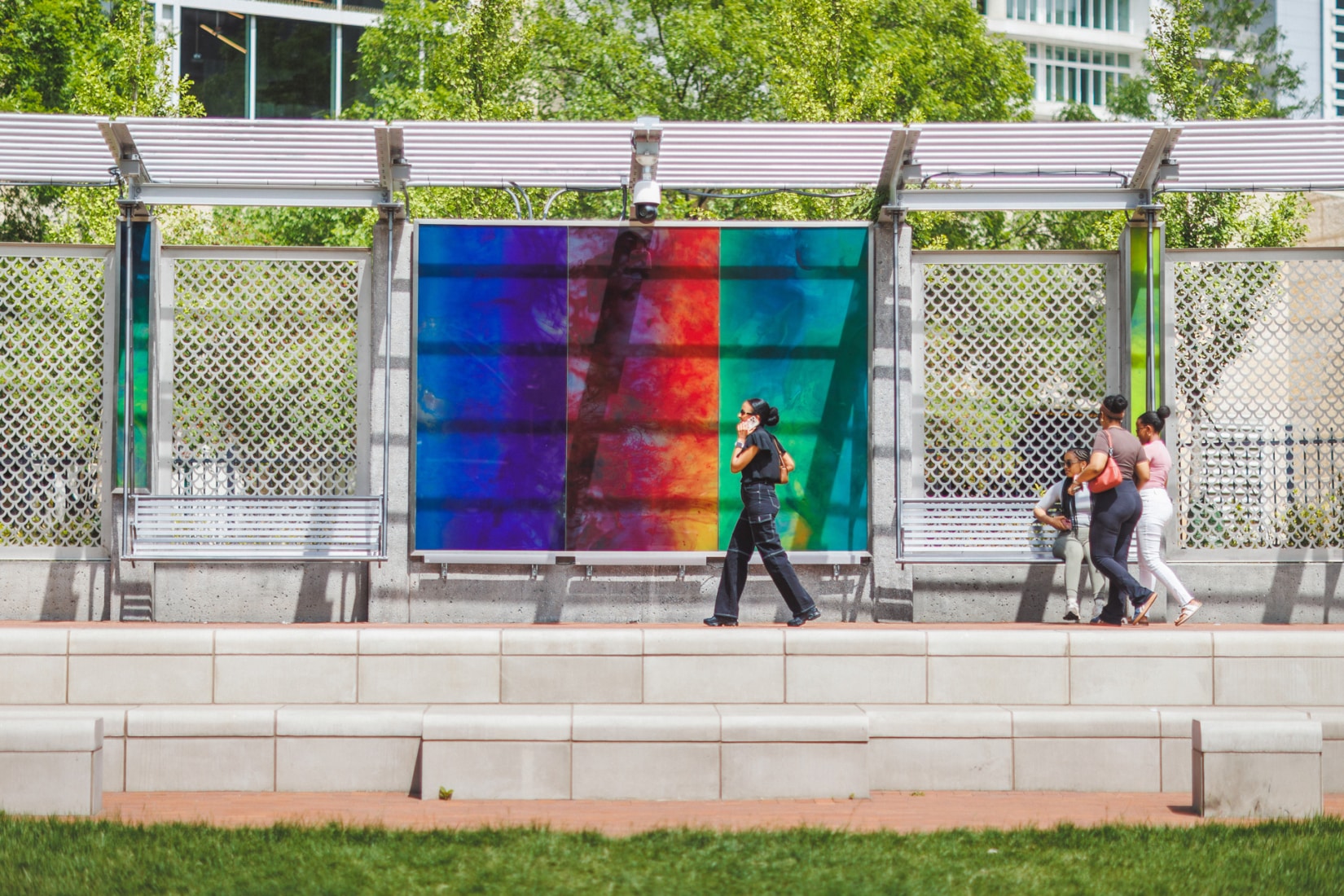 Public art created in glass can contribute to shading strategies, daylight modulation, and privacy gradients while carrying narrative, imagery, or cultural symbolism.