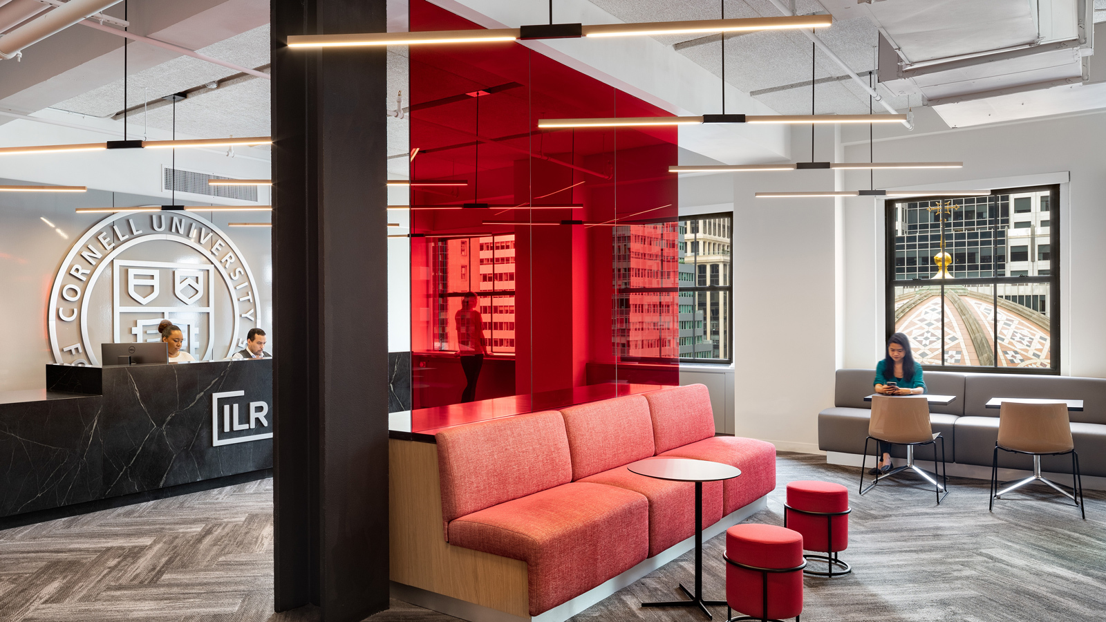 At the Cornell ILR campus, visitors enter through a striking laminated red transparent glass wall in the lobby, which opens into a full-length branded gradient glass installation. Fabricated by Skyline, the custom wall-cladding creates a dynamic visual transition and reinforces Cornell’s identity within a modern, cohesive interior.