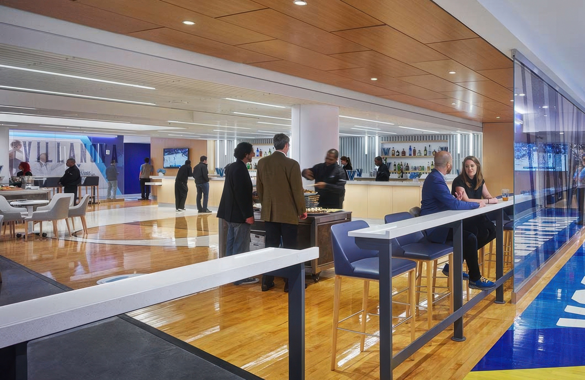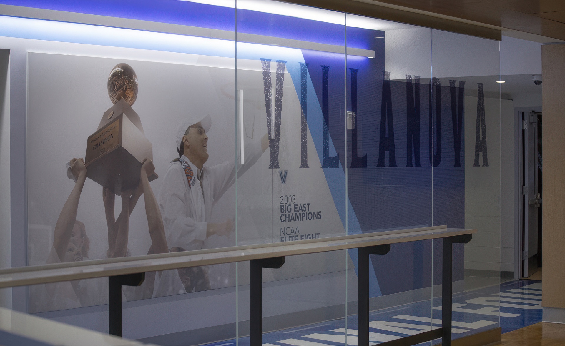 Skyline collaborated with EwingCole to enhance Villanova University’s Finneran Pavilion by providing custom glass for the club area. Our glass features durable branding elements, with the design fired into tempered safety glass during the tempering process for longevity. This ensures a lasting and reliable solution for the space while complementing the Pavilion’s modern design.