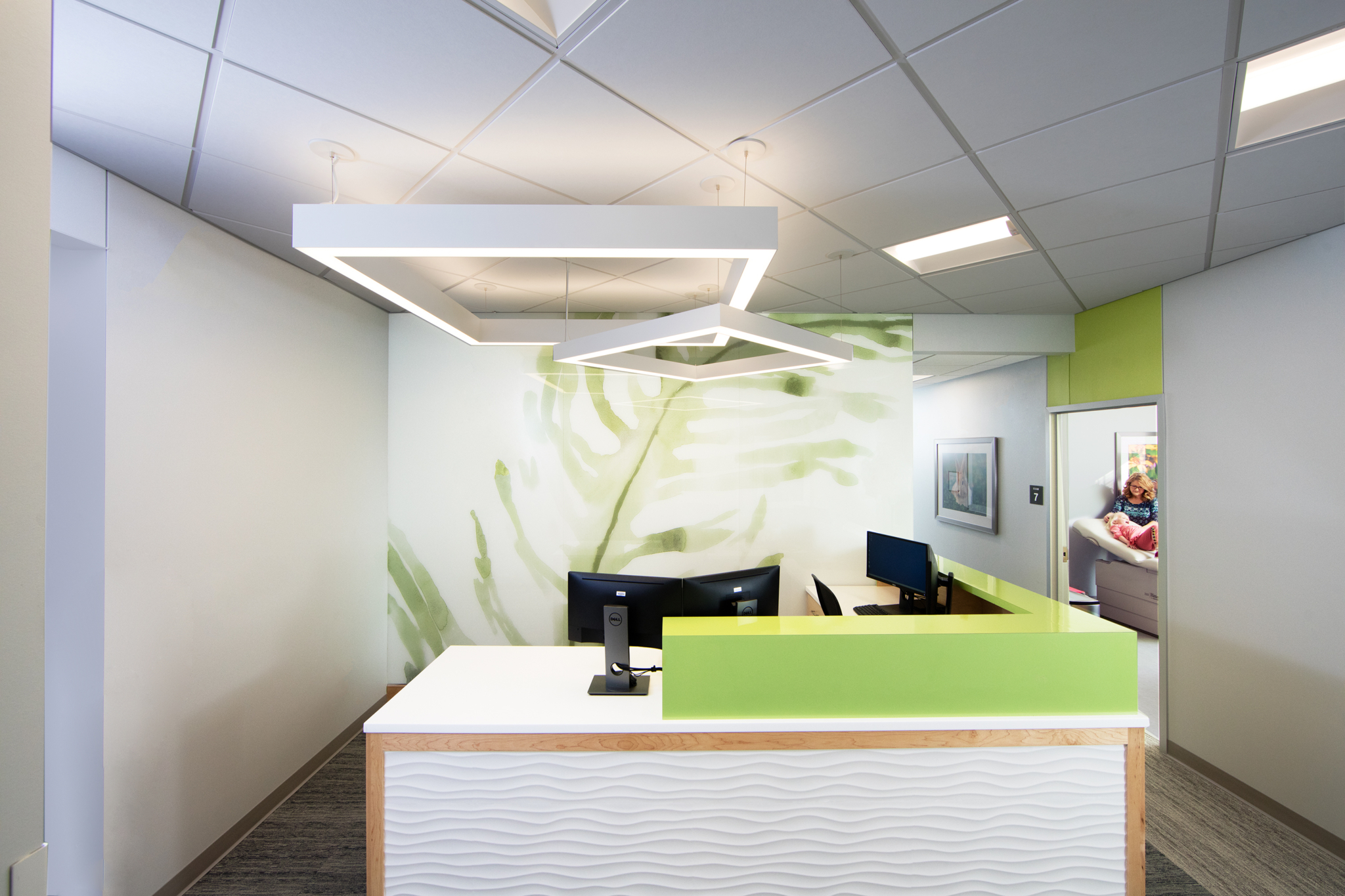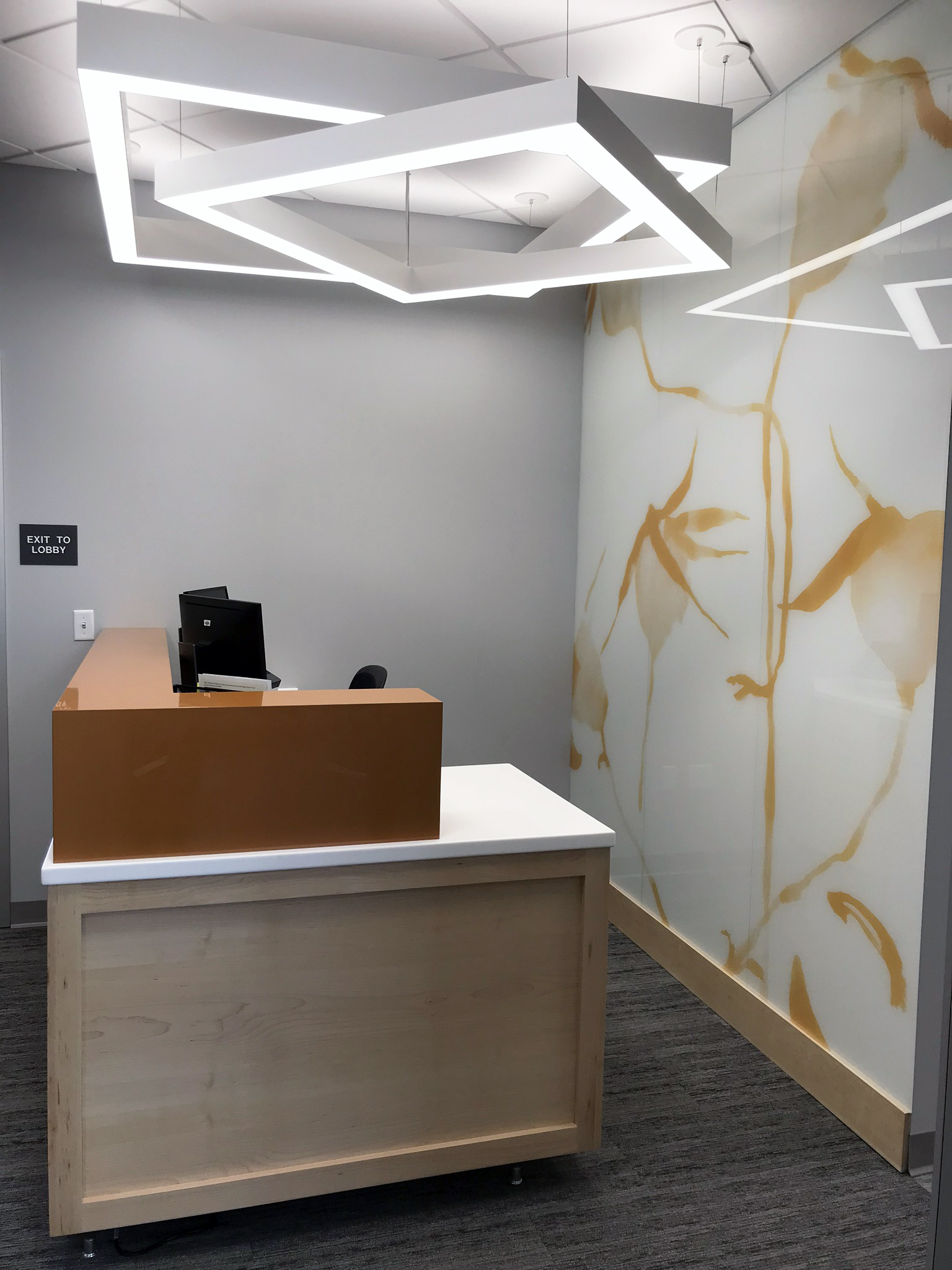 At IU Health Riley Outpatient Center, digitally printed and back-painted glass panels bring Feather by Susan Hable Smith and Bulbs by Susan Hable Smith patterns to life in a custom colorway. Installed as wall cladding, the design introduces visual rhythm and organic form into the healthcare environment—supporting wellness through biophilic reference.