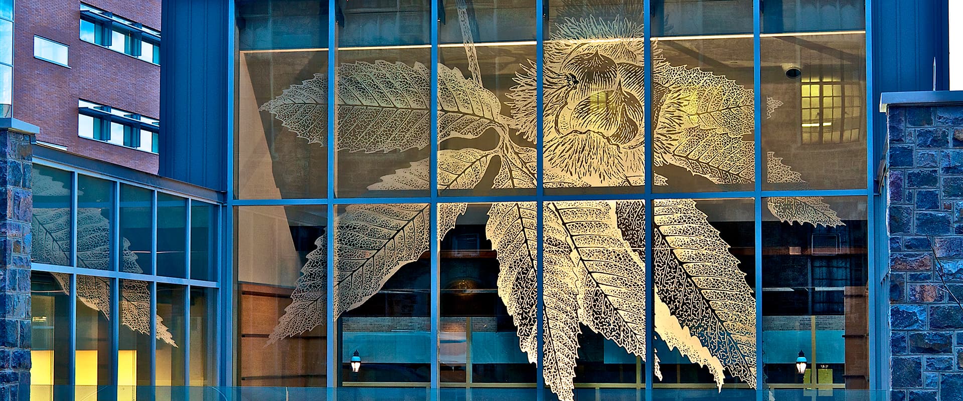 Skyline collaborated with artist Larry Kirkland to produce two significant etched glass installations for Lehigh University’s Science, Technology, Environment, Policy & Society (STEPS) building. These included a massive curtain wall measuring 70 x 20 feet and a large window of 15 x 22 feet. These installations, comprising 28 and 12 glass panels respectively, were designed to embody the mission of the center.