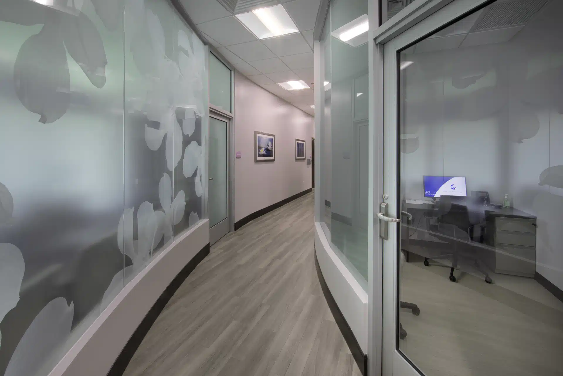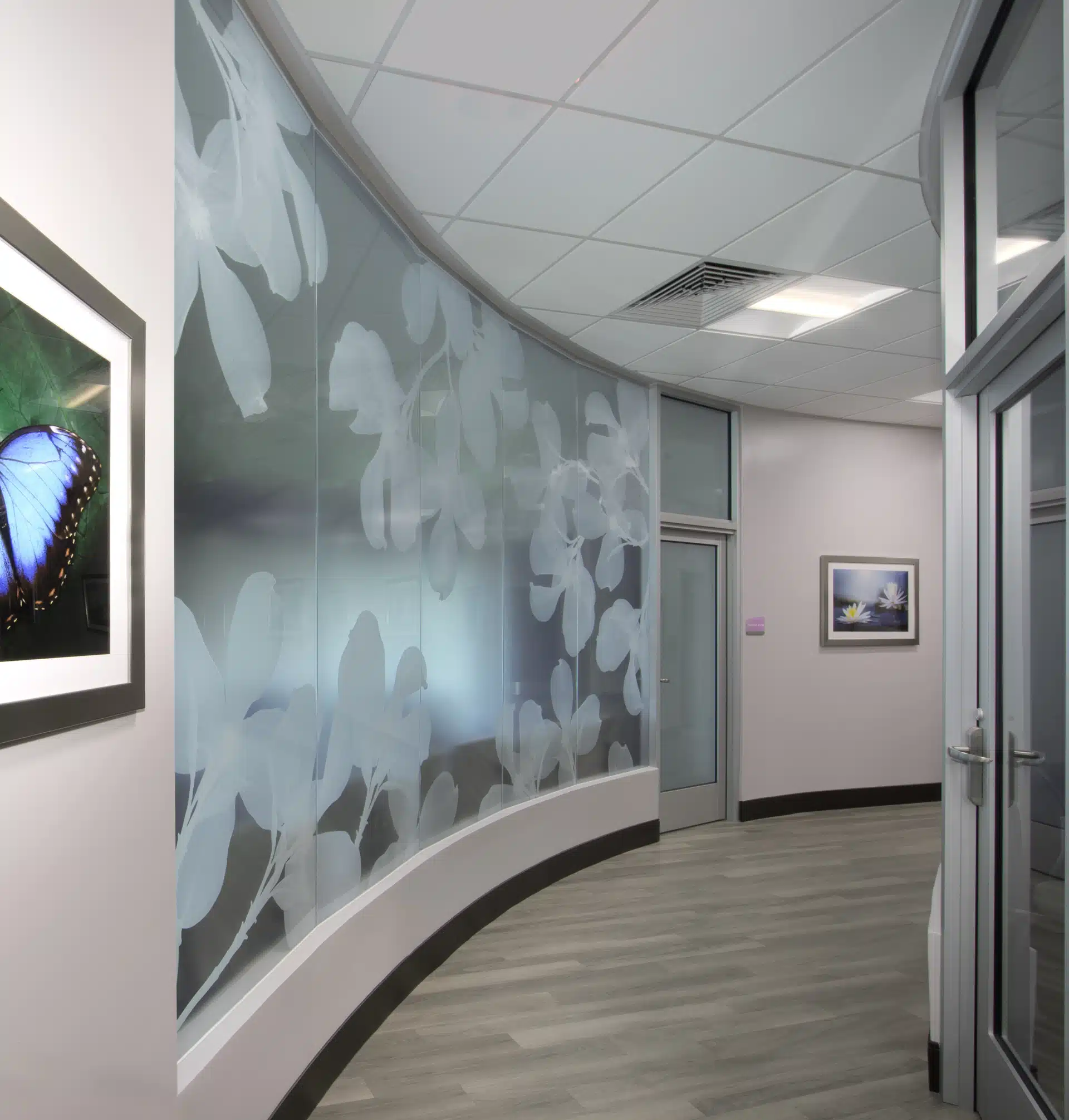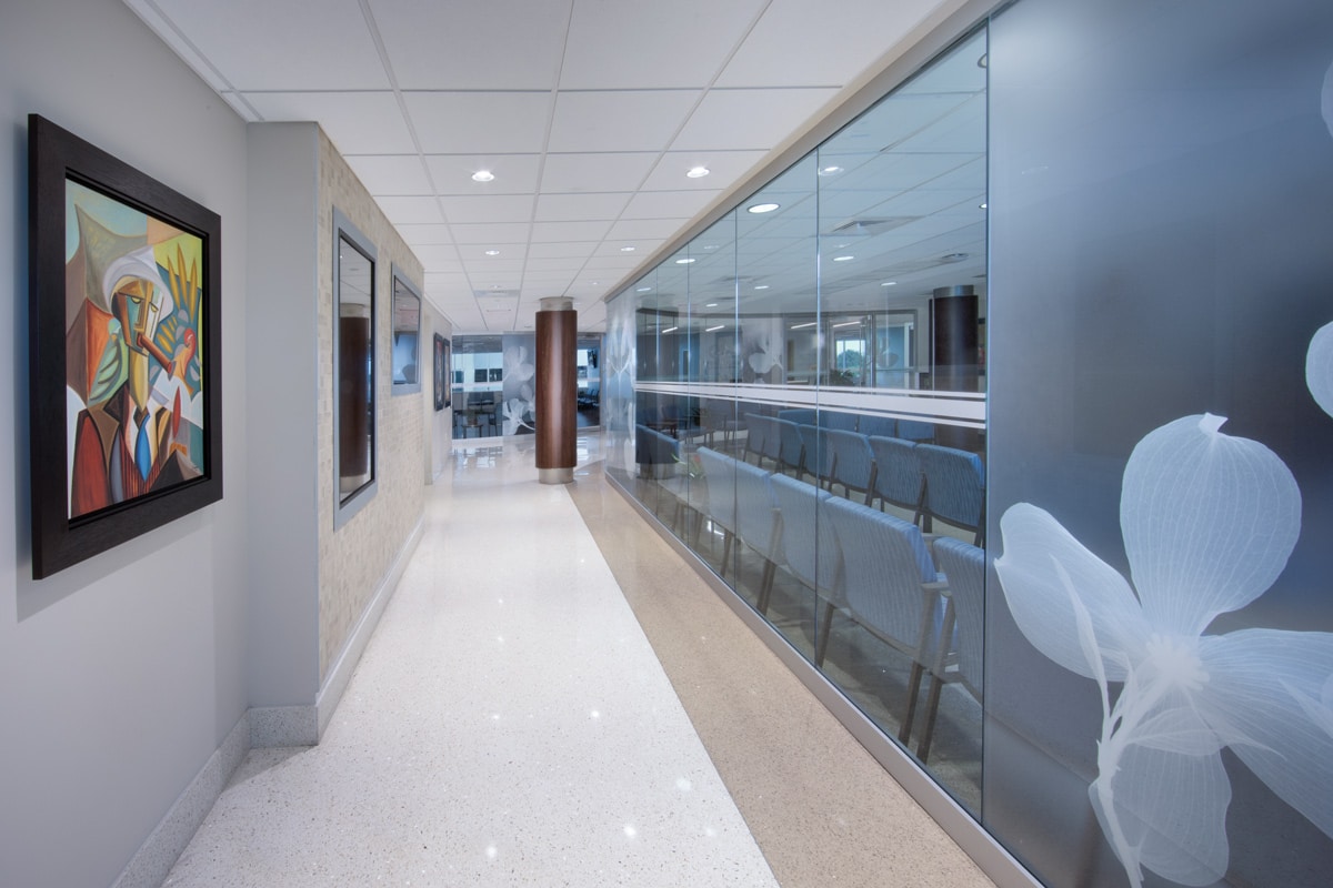 Leon Medical Centers – Kendall in South Florida features Dogwood 1 by Steve Meyers printed direct to glass. This design enhances the healthcare environment with a healing and calming aesthetic while maintaining the partial privacy of the modular wall system.