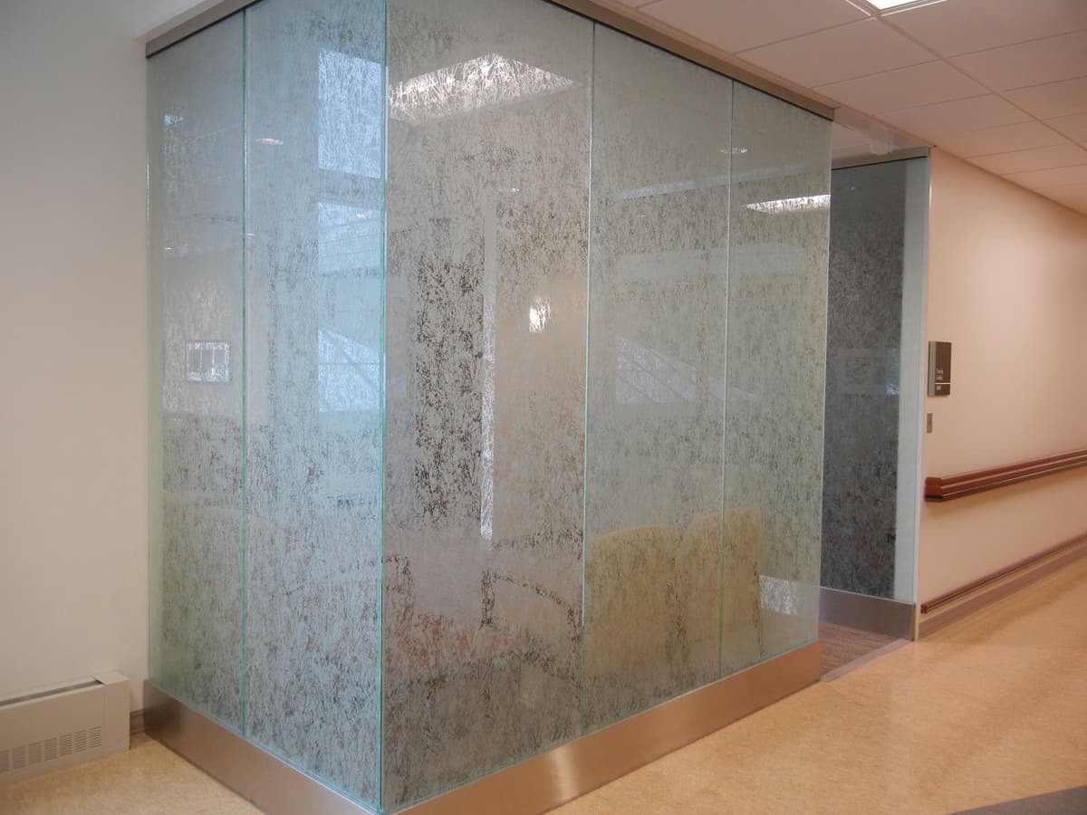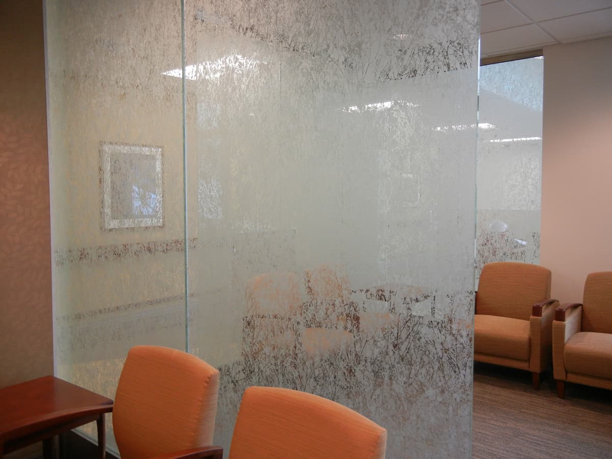 Glass walls throughout the facility etched with the Branches pattern, balancing privacy with light transmission in patient and public areas.