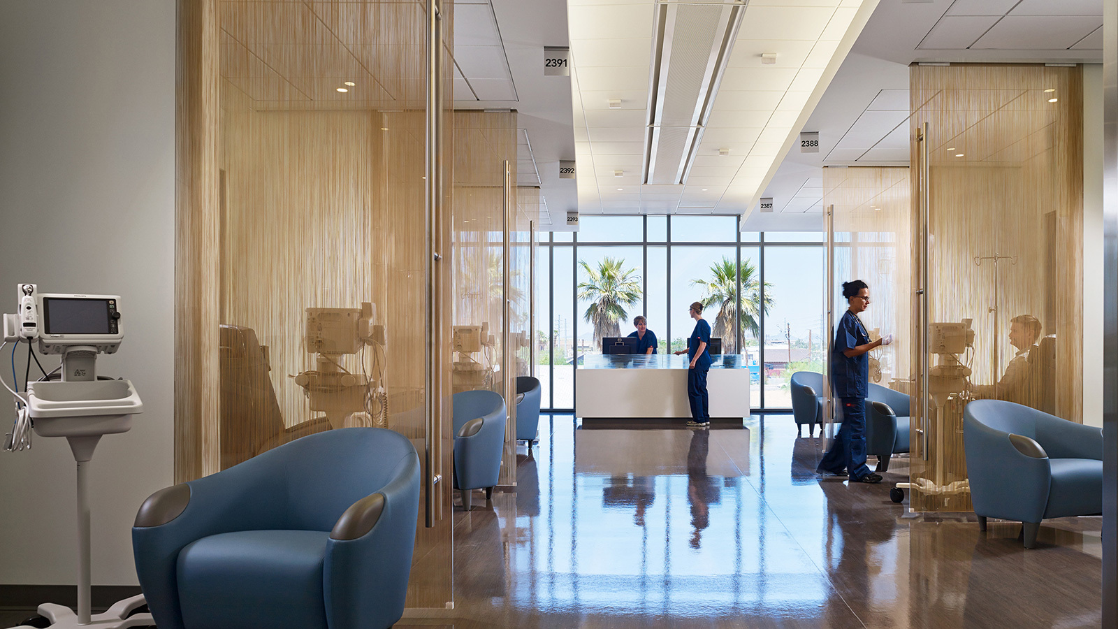 Skyline fabricated floor-to-ceiling glass panels featuring a printed gold Sateen pattern for the dialysis stations at the University of Arizona Cancer Center. The design offers light privacy and maintains nurse visibility while preserving views of the surrounding landscape for patients.
